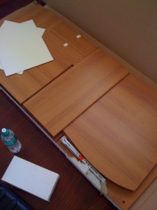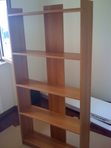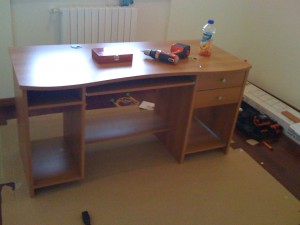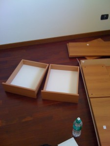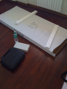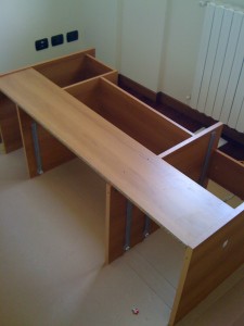 Ecco qui una carrellata del montaggio, tutto eseguito del sottoscritto, della scrivania e delle due librerie (anche se qui ne vedete solo una) che popoleranno il mio studio. Il tutto eseguito in un paio di giorni, senza grosse difficoltà, a parte un pezzo che mancava clamorosamente nella scatola e che mi è stato comunque fornito a tempo di record dal negozio (no, non mi va di far pubblicità). Comunque la soddisfazione, devo dire, è stata tanta.